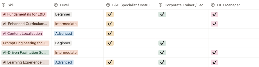Our AI Skills taxonomy is designed to integrate with the frameworks you already use. It can be mapped into job architecture, competency models, skills libraries, and L&D pathways so you do not need to start from scratch. The result is a practical add-on that strengthens existing structures with AI skills for non-technical roles.