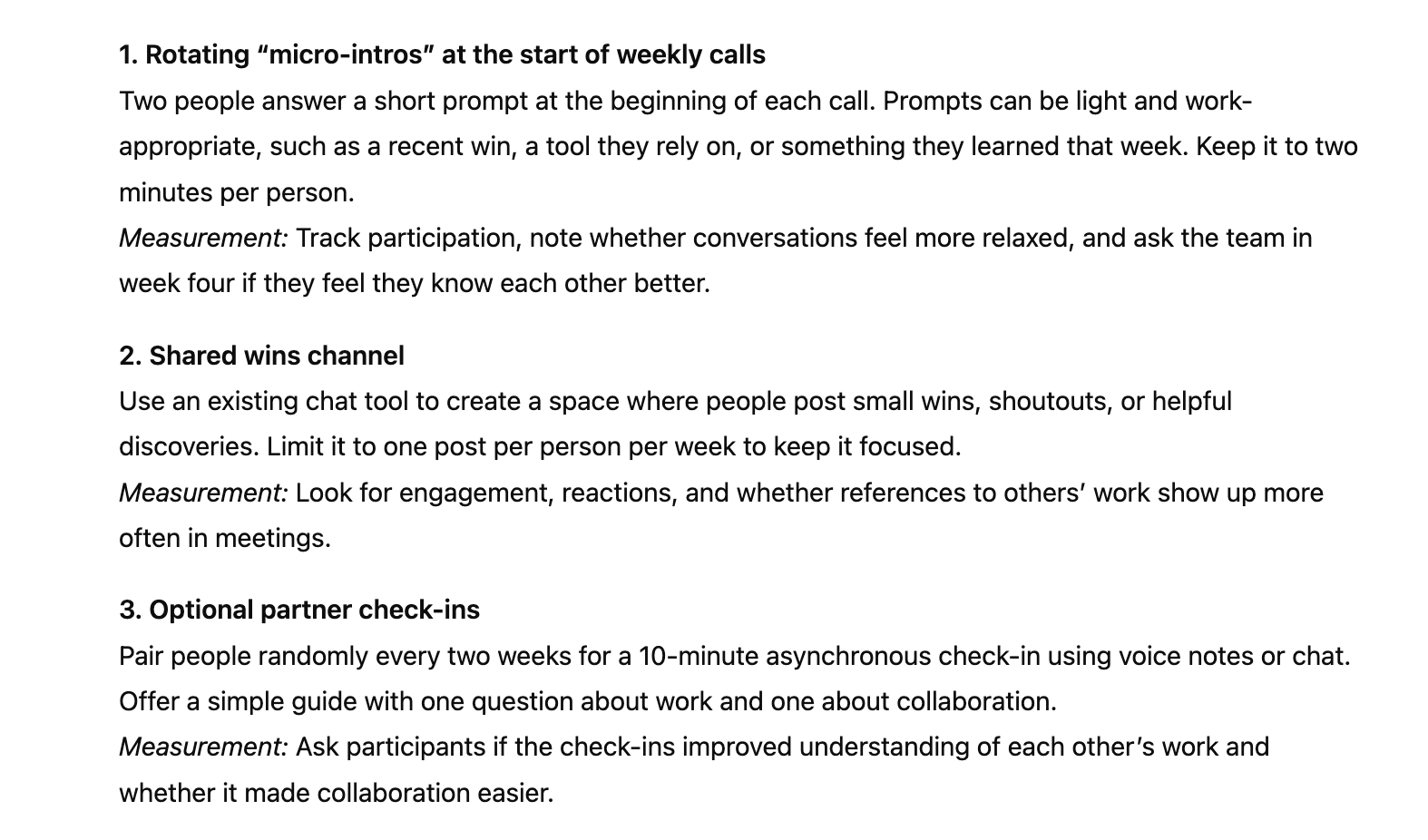My remote team of 6 people feels disconnected. Our weekly video calls are productive but transactional. I want to run a 4-week experiment to build more connection without adding unnecessary meetings. Suggest three different lightweight approaches we could try, including how I'd measure if they're working.